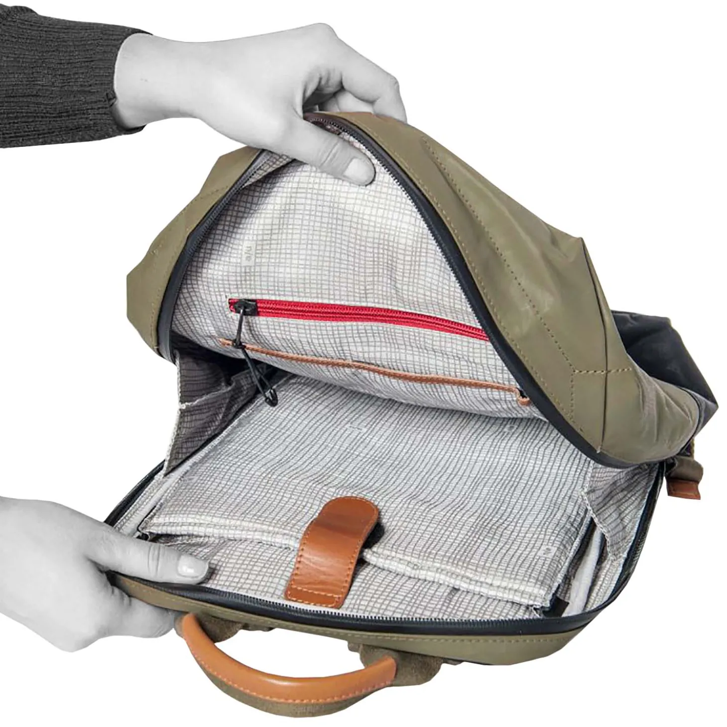 Das großzügige Hauptfach lässt sich dank des weit umlaufenden Reißverschlusses weit öffenen, was für eine übersichtliche Einteilung sorgt, und wird durch ein gepolstertes Laptopfach und ein Reißverschlussfach ergänzt. Ein Reißverschlussfach auf der Vorderseite bietet Platz für kleinere Gegenstände, die schnell griffbereit sein sollten. Außen, auf der Rückseite, befindet sich ein weiteres Reißverschlussfach, indem sich beispielsweise das Handy toll verstauen lässt. Es ist durch den Reißverschluss gut geschützt und auch für Fremde schwer zugänglich, da es so nah am Rücken ist – man selber kann den Inhalt des Faches aber schnell und einfach erreichen.