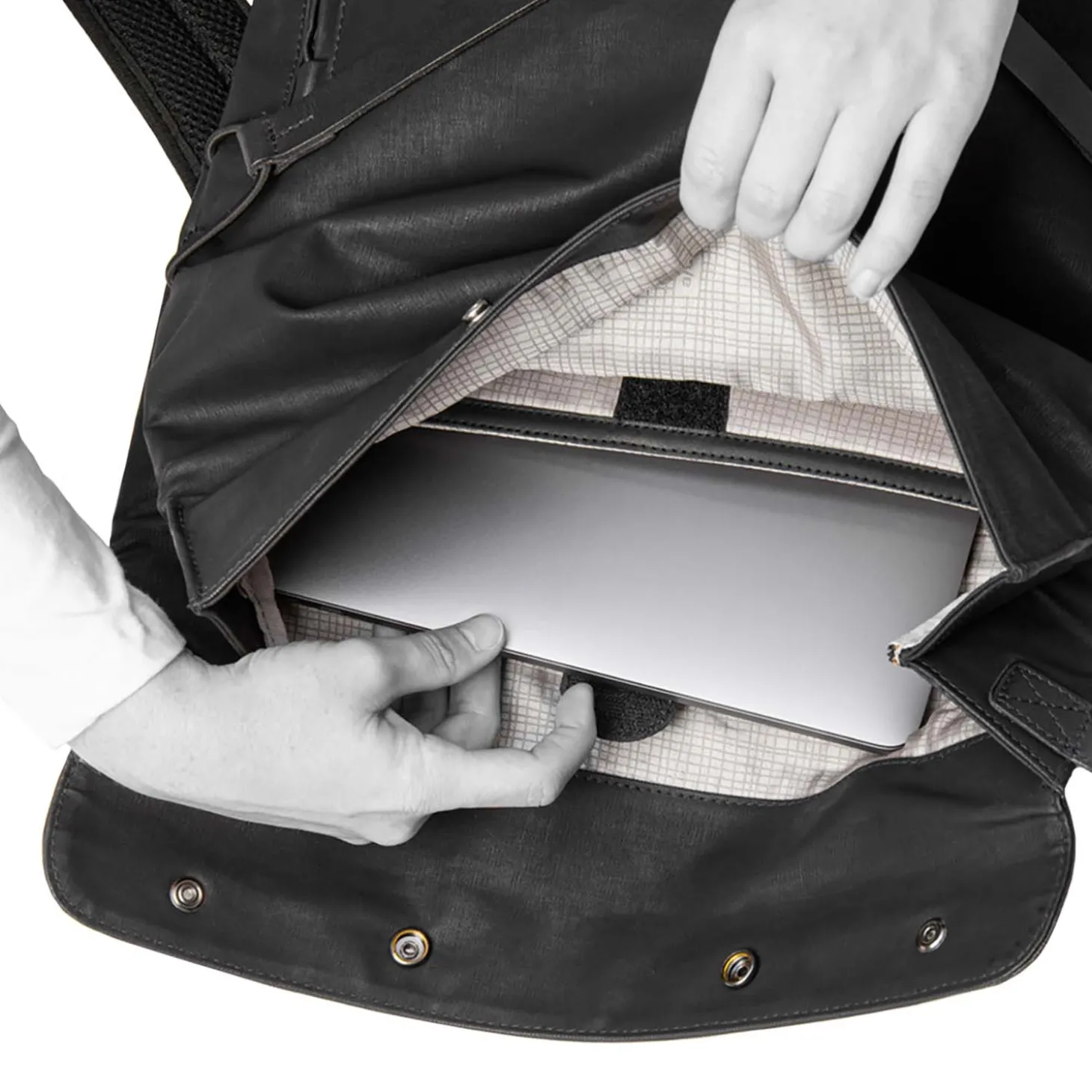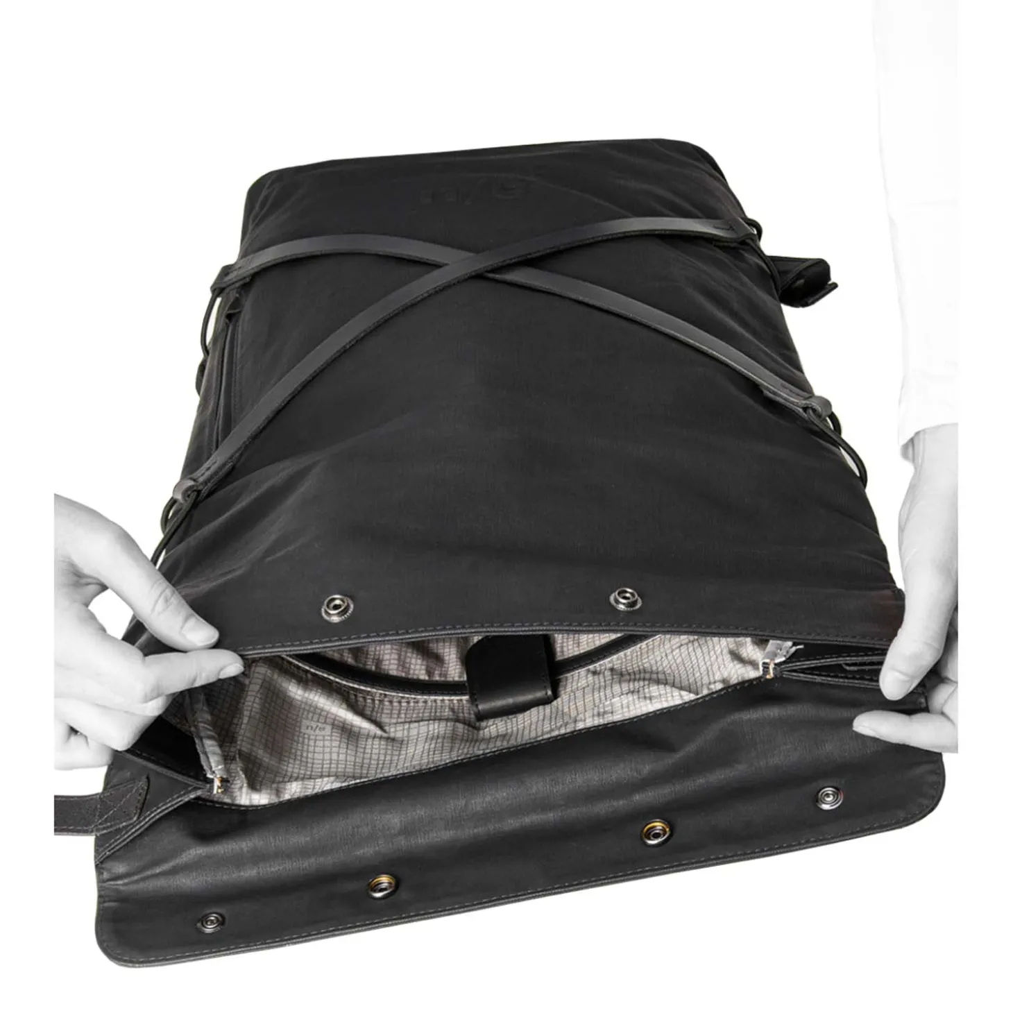 Das Hauptfach schließt mit dem Rollverschluss und Druckknöpfen und beinhaltet ein gepolstertes Tabletfach, ein großes Reißverschlussfach, ein Steckfach, ein Handyfach und zwei Schlaufen für Stifte. Der lederne Boden ist verstärkt. Außen hat der Osaka ein großes, wasserdichtes Reißverschlussfach an der Oberseite, sowie je ein wasserdichtes Reißverschlussfach auf der Vorder- und auf der Rückseite.