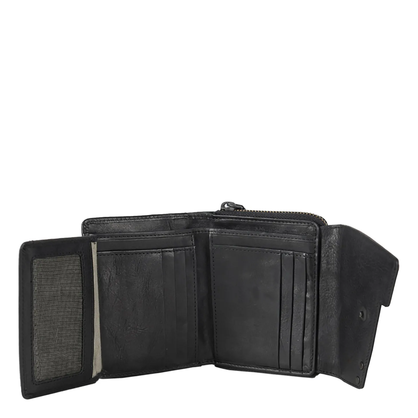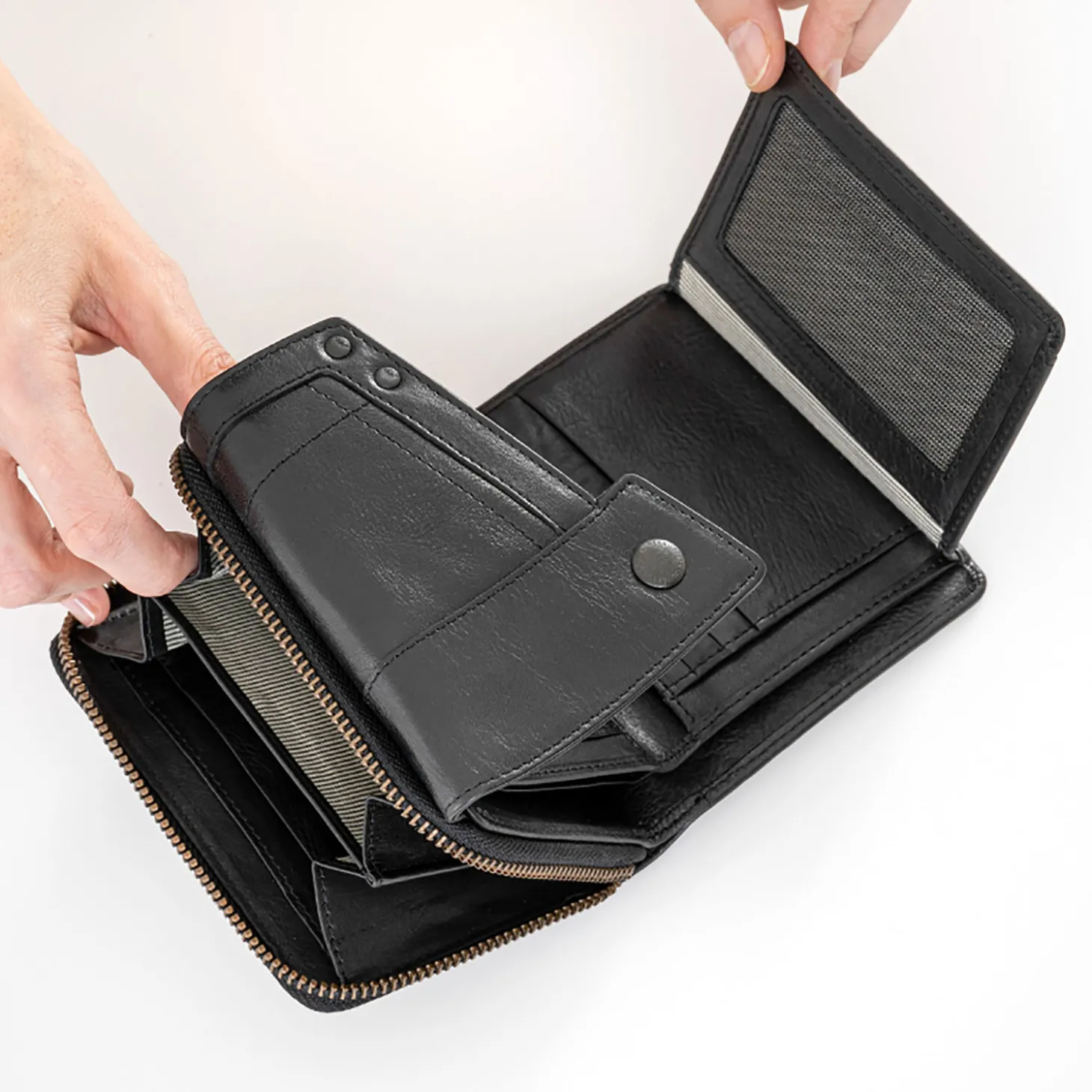 Die Einteilung ist ebenso übersichtlich, wie praktisch. Es gibt ein unterteiltes Scheinfach mit zwei versteckten Kartenfächern, ein unterteiltes Münzfach, ein Reißverschlussfach, sieben Steckfächer und 12 weitere Kartenfächer.