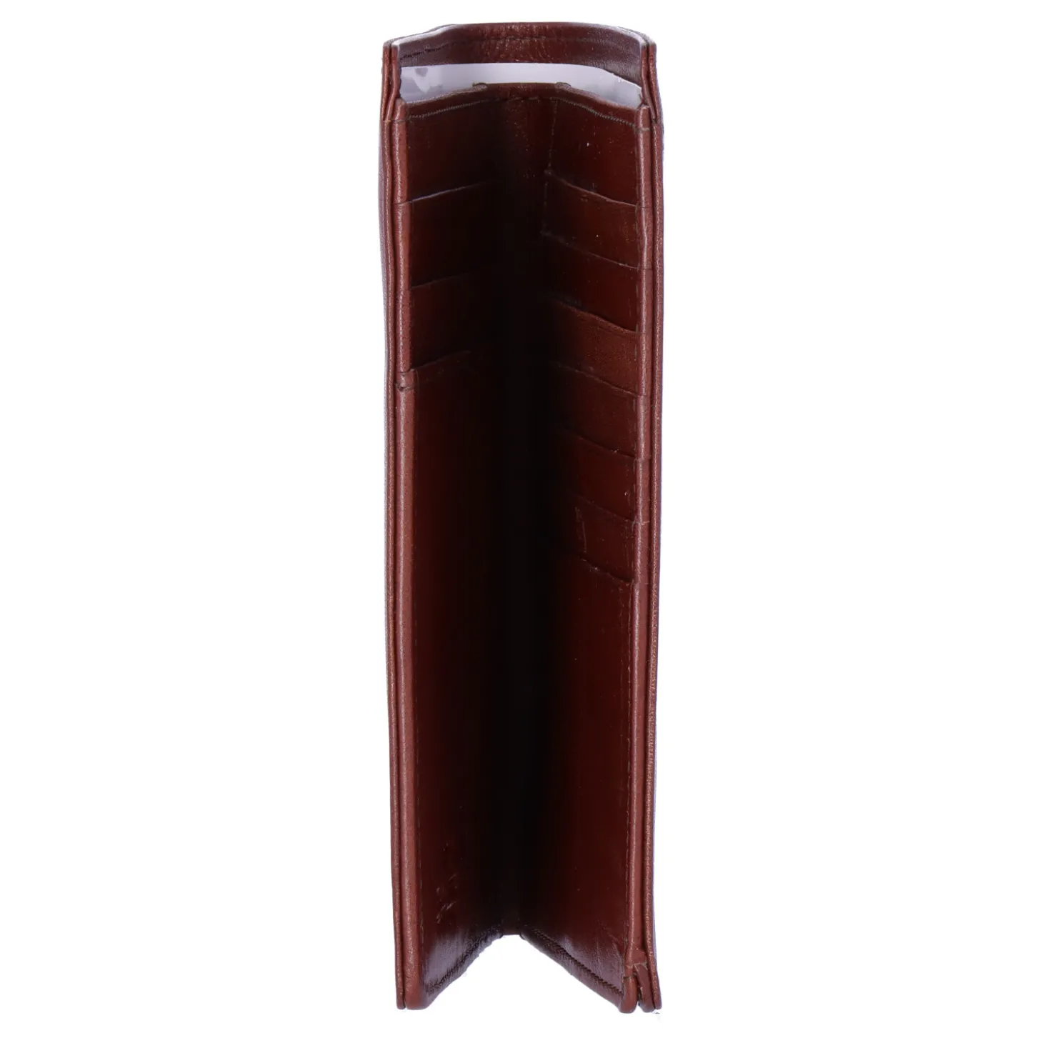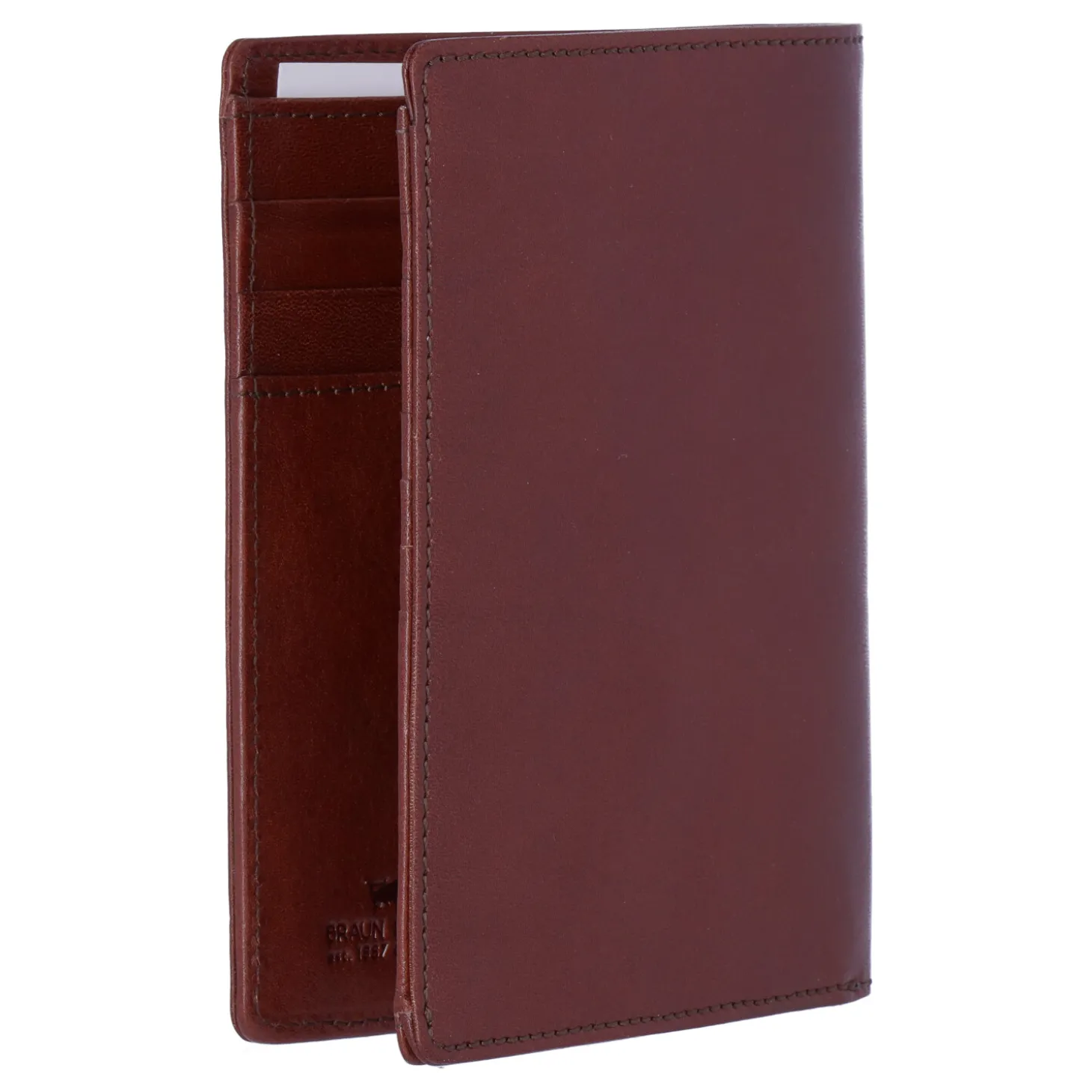 Brieftasche im Hochformat, schmal und elegant, gefertigt aus hochwertigem, vegetabil gegerbtem Rindleder. Die spezielle Anordnung beim Öffnen gewährt einen klaren Überblick über alle Karten. Durch großzügige Steck- und Scheinfächer bietet die Brieftasche ausreichend Platz für zusätzliche Karten, Geldscheine und Belege. Ein geschickt integrierter Stifthalter in der Mitte komplettiert die funktionale Gestaltung dieser stilvollen Brieftasche.