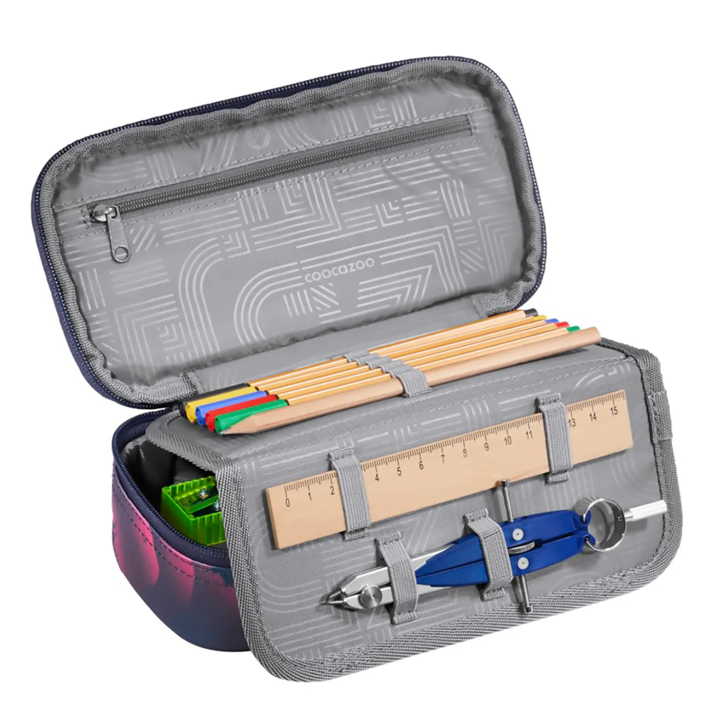 In diesem Schlampermäppchen geht nichts verloren, dafür sorgen sechs Schtifschlaufen und extra Fächer für Geodreieck, Zirkel und Lineal. Kleine Dinge wie Tintenpatronen, Münzen und USB-Sticks sind in einem extra Reißverschlussfach sicher aufgehoben.