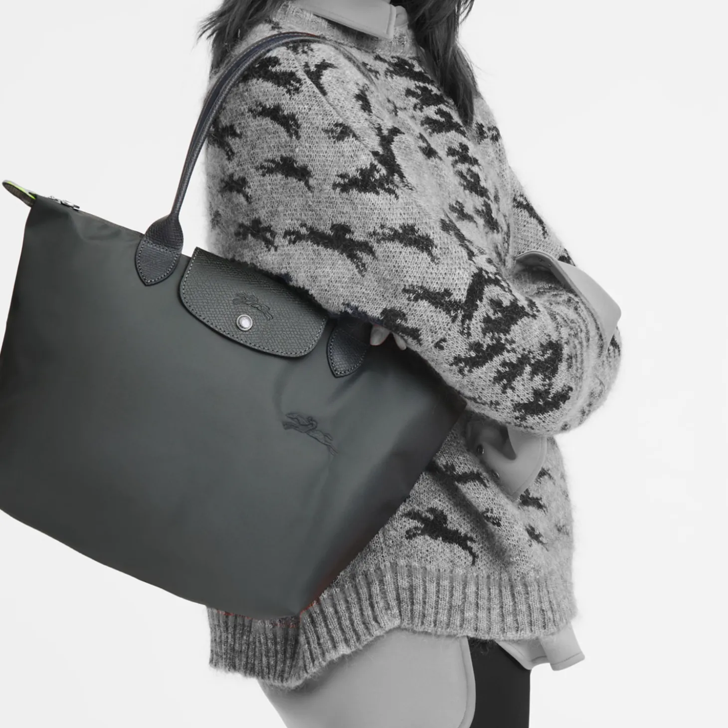 Wie alle Modelle aus dieser Serie läßt sich auch dieses auf eine minimale Größe zusammenfalten. Die Inspiration zu der speziellen Falttechnik ist auf die japanische Origami-Kunst zurückzuführen und machte die LE PLIAGE von Longchamp zu einem weltweiten Klassiker.