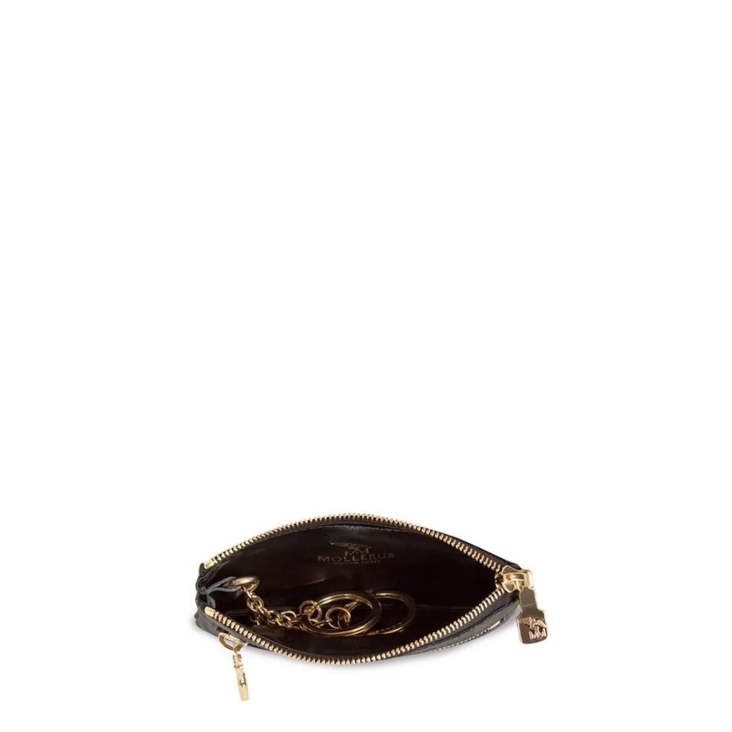 Dieses edle, kleine Schlüsseletui von Maison Mollerus ist schon jetzt ein großer Liebling von uns. Es schließt mit einem goldenen Reißverschluss und hat außen ein kleines Extrafach mit Reißverschluss. Auch die beidenen Schlüsselbänder mit den Ringen sind goldfarben.