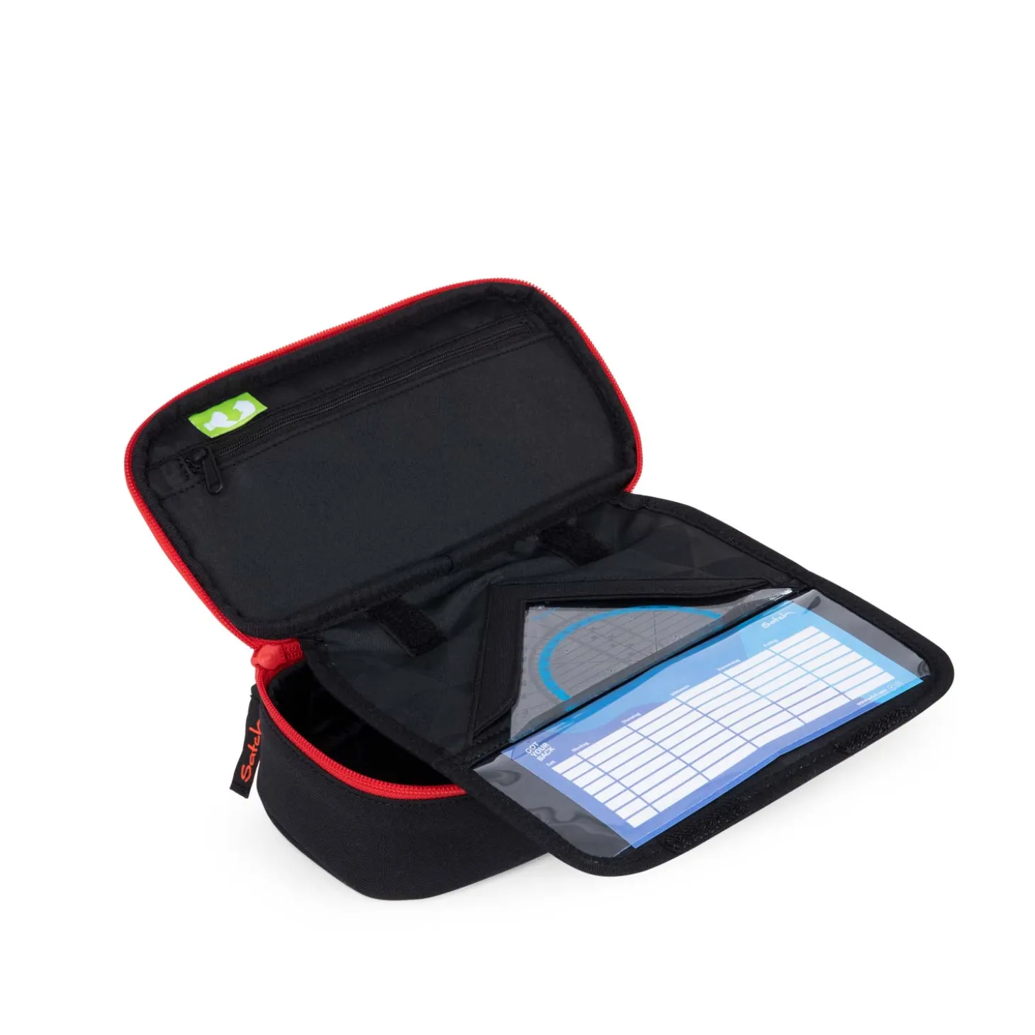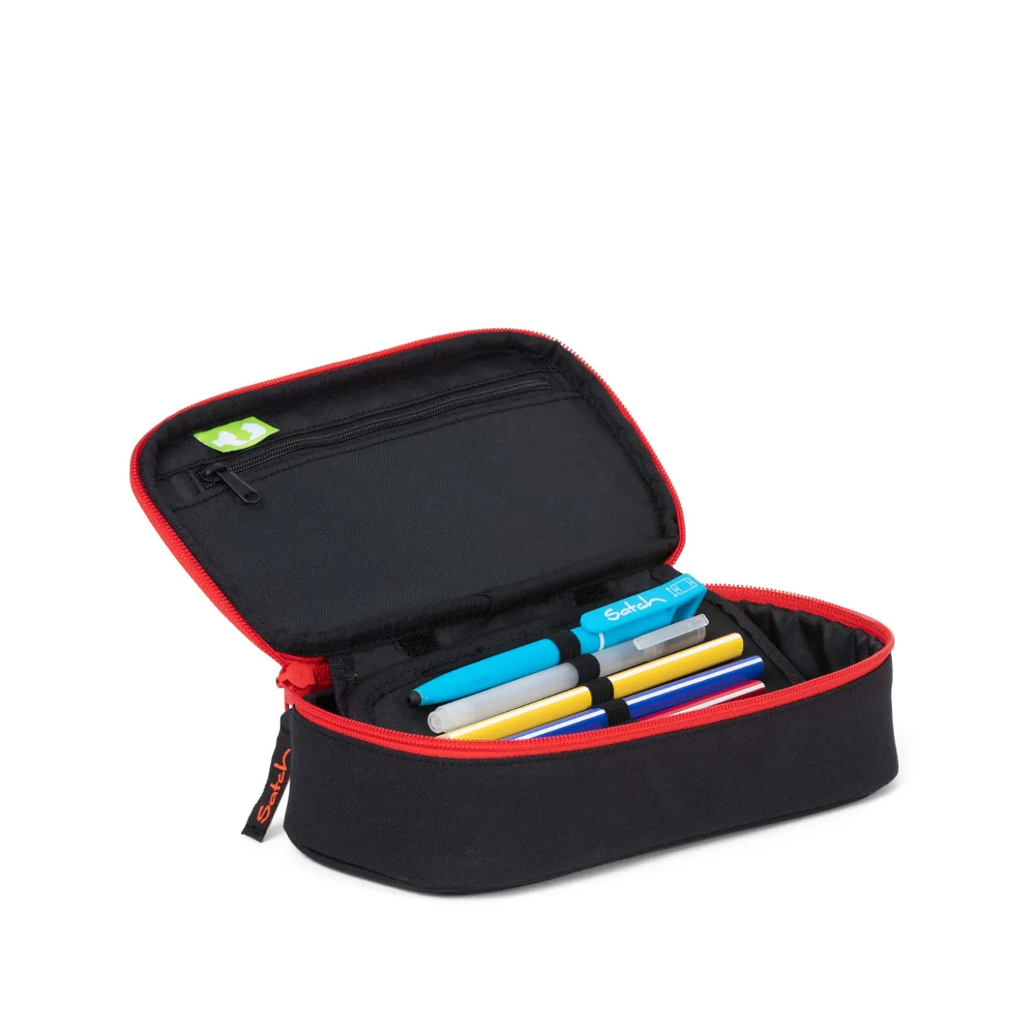 Das Mäppchen von Satch bietet extra viel Platz für Stifte, Geodreieck & Co.. Für Ordung sorgen Gummibänder und ein Trennfach mit Organisationsfunktion. In dem kleinen Reißverschlussfach lassen sich Tintenpatronen oder etwas Kleingeld sicher verstauen.