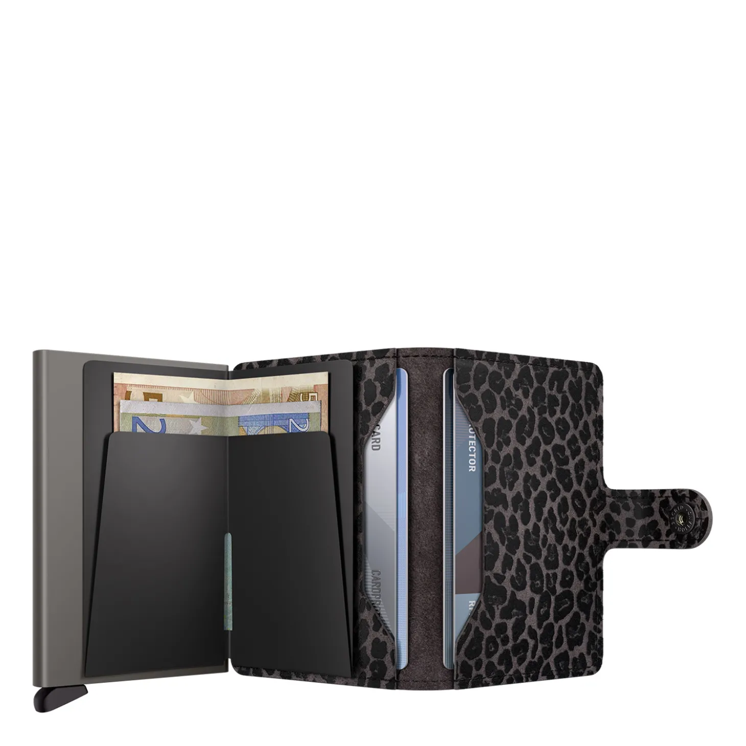 Das Miniwallet von Secrid besteht aus einem Cardprotector aus Aluminium und einer Hülle aus hochwertigem Leder, die mit einem Druckknopf schließt. In dem Cardprotector können bis zu vier Karten mit oder sechs Karten ohne Prägung untergebracht werden. Zudem ist in der Lederhülle Platz für sechs weitere Karten, sowie für Banknoten und Belege.