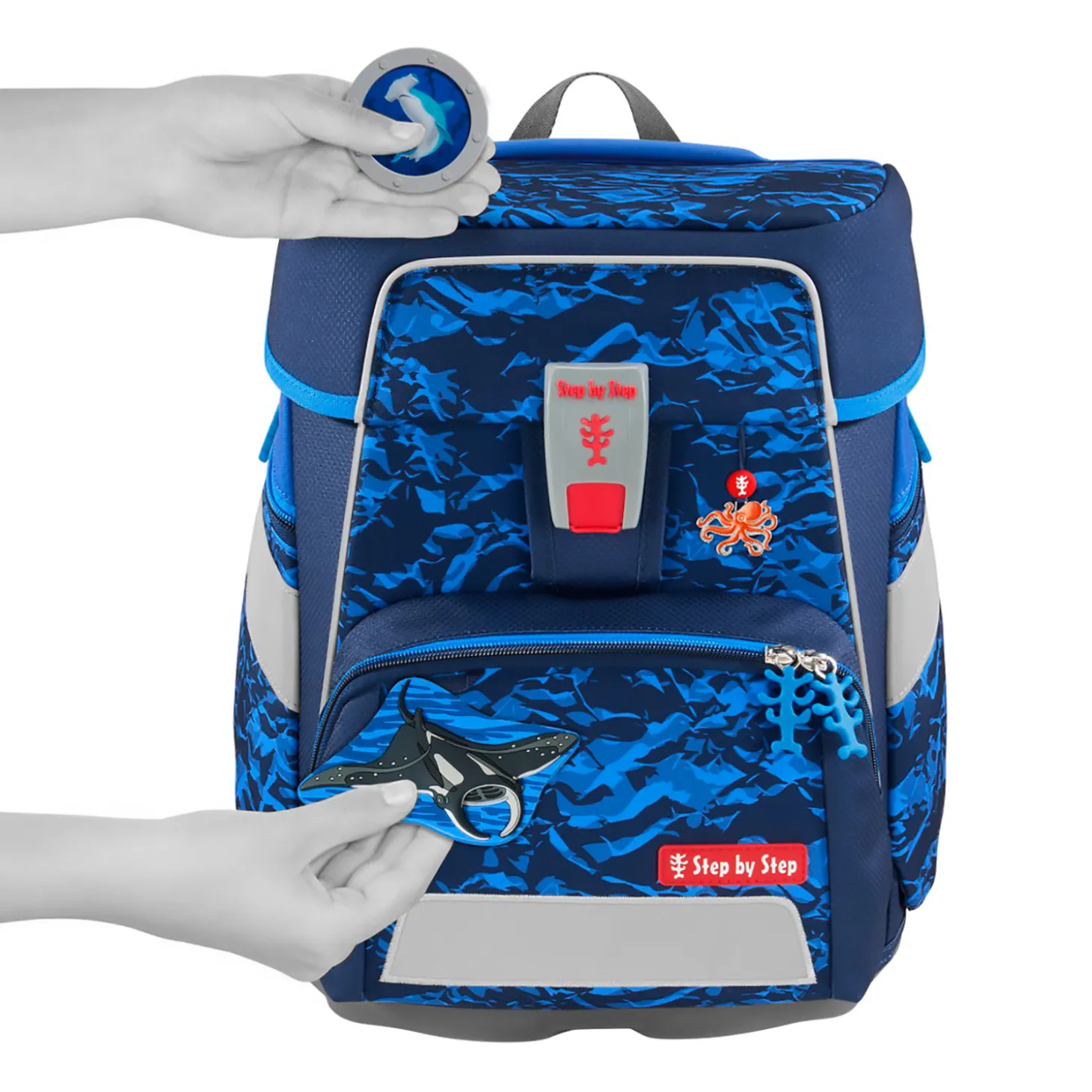 Der SPACE von Step by Step umfasst bereits alles, was für den Schulstart benötigt wird: ein gefülltes Federmäppchen, ein Schlampermäppchen, einen Sportbeutel, der sich am Schulranzen befestigen lässt und ein Set Magic Mags bestehend aus zwei Magneten und einem Anhänger. Die Magneten können nach Lust und Laune auf dem Schulranzen befestigt werden.
