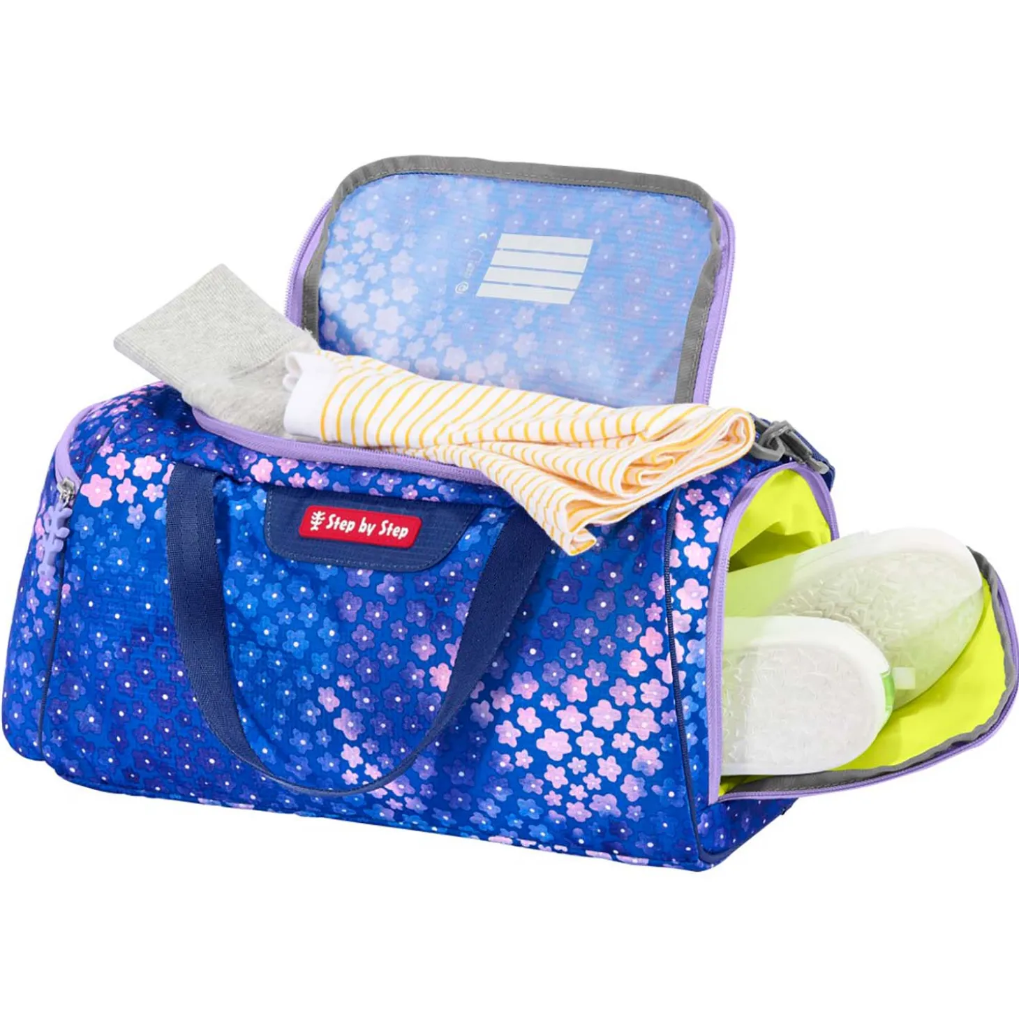 Diese Sportasche von Step by Step ist die ideale Ergänzung zu den Schulranzen, aber natürlich auch jederzeit ein zuverlässiger Begleiter auf dem Weg zum Freizeitsport.