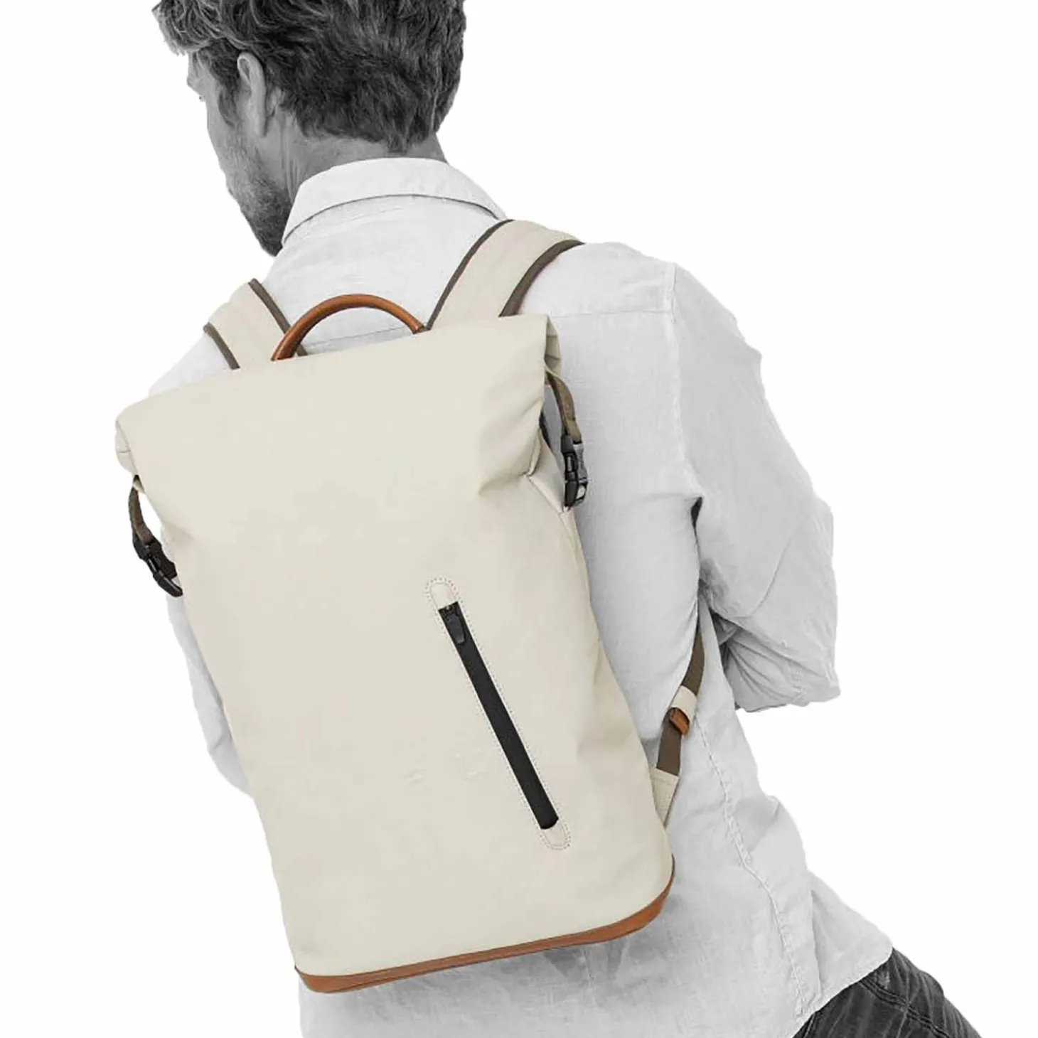 Fukui bietet so viele Funktionen – das Hauptfach ist über den Rolltop-Verschluss oder den Reißverschluss auf der Rückseite des Rucksacks zugänglich und beinhaltet ein gepolstertes Laptopfach, ein Reißverschlussfach und diverse Steckfächer für Handy und Stifte. Der Reißverschluss auf der Rückseite lässt sich weit öffnen, was eine übersichtliche Einordnung des Inhalts ermöglicht. Ein Reißverschlussfach auf der Vorderseite des Rucksacks sorgt nicht nur optisch für einen Hingucker, sondern bietet auch Platz für kleine Gegenstände, die schnell griffbereit sein sollen.