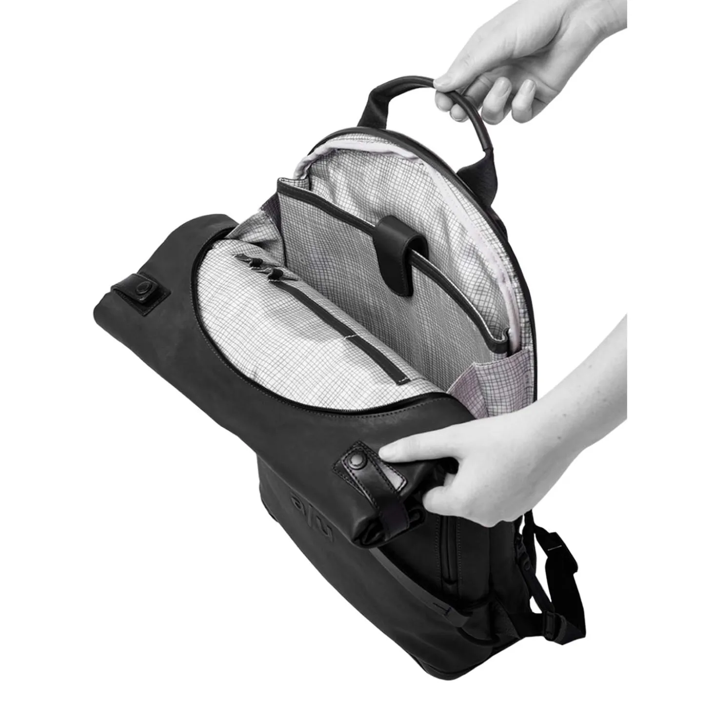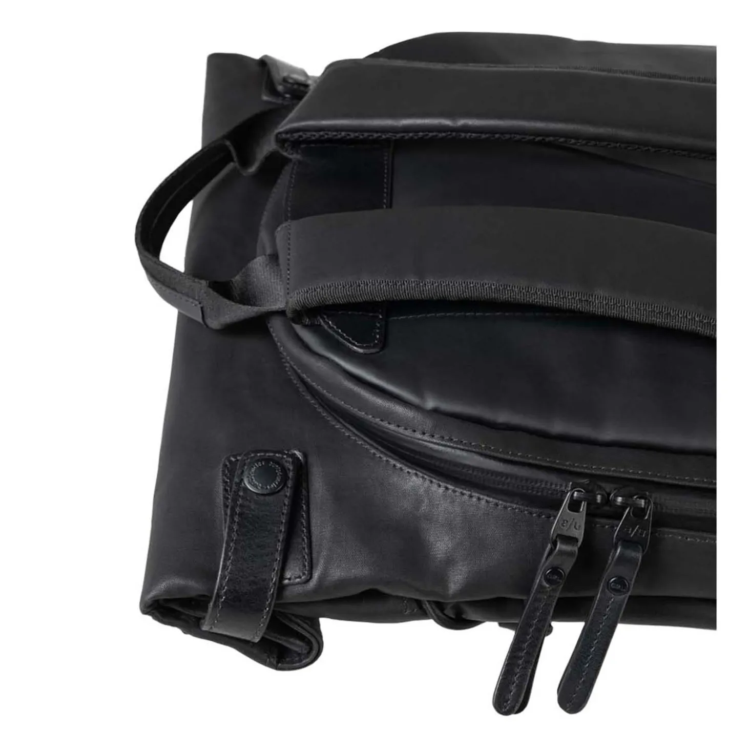 Das Hauptfach schließt mit dem Rollverschluss und Druckknöpfen und beinhaltet ein gepolstertes Tabletfach, ein großes Reißverschlussfach, ein Steckfach, ein Handyfach und zwei Schlaufen für Stifte. Der lederne Boden ist verstärkt. Außen hat der Osaka ein großes, wasserdichtes Reißverschlussfach an der Oberseite, sowie je ein wasserdichtes Reißverschlussfach auf der Vorder- und auf der Rückseite.