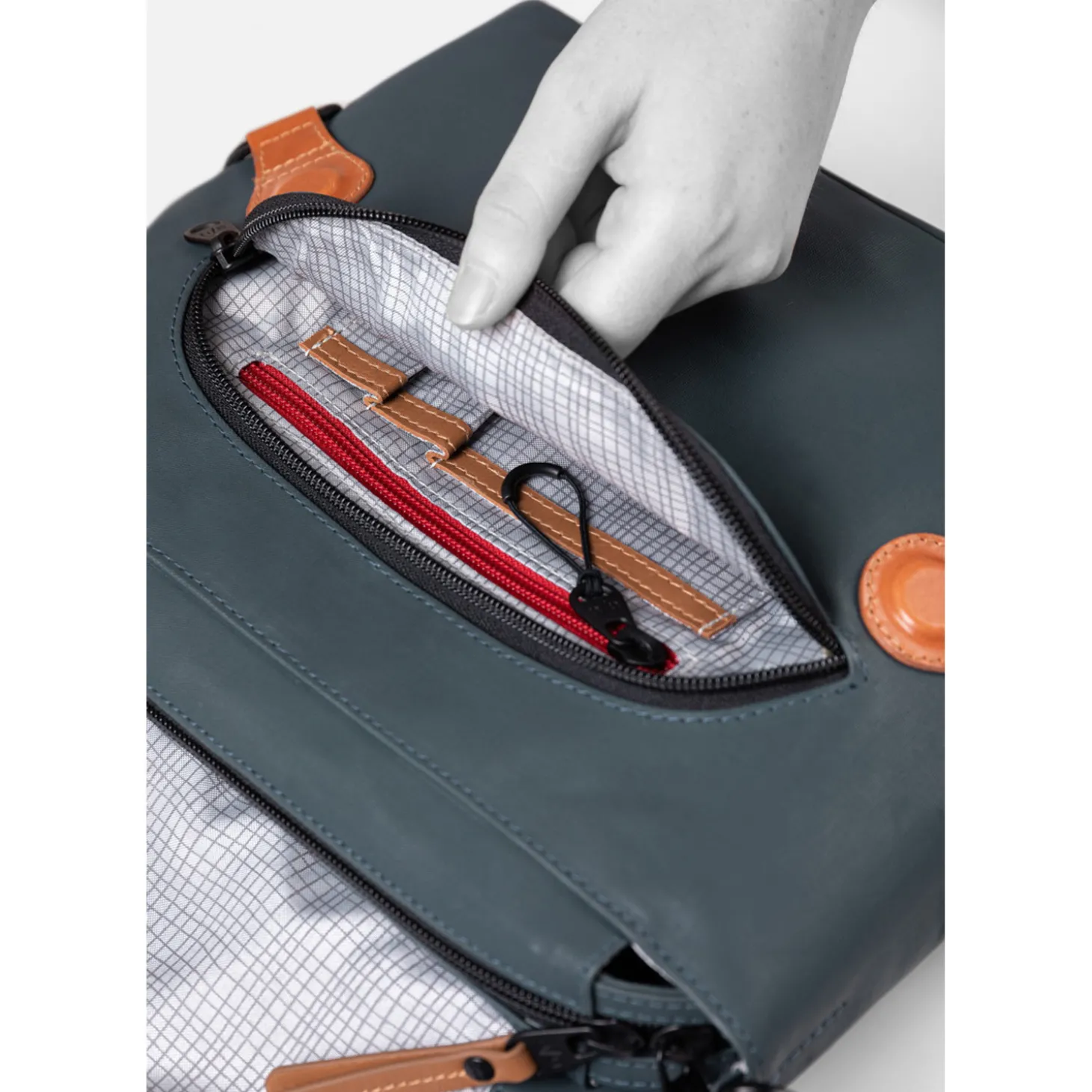 Das geräumige Hauptfach schließt mit einem Reißverschluss und beinhaltet ein gepolstertes Tabletfach, ein Handyfach und ein Schlüsselband. Außerdem gibt es ein Reißverschlussfach mit einer integrierten Reißverschlusstasche unter dem Überschlag und ein weiteres wasserdichtes Reißverschlussfach auf der Rückseite der Tasche.