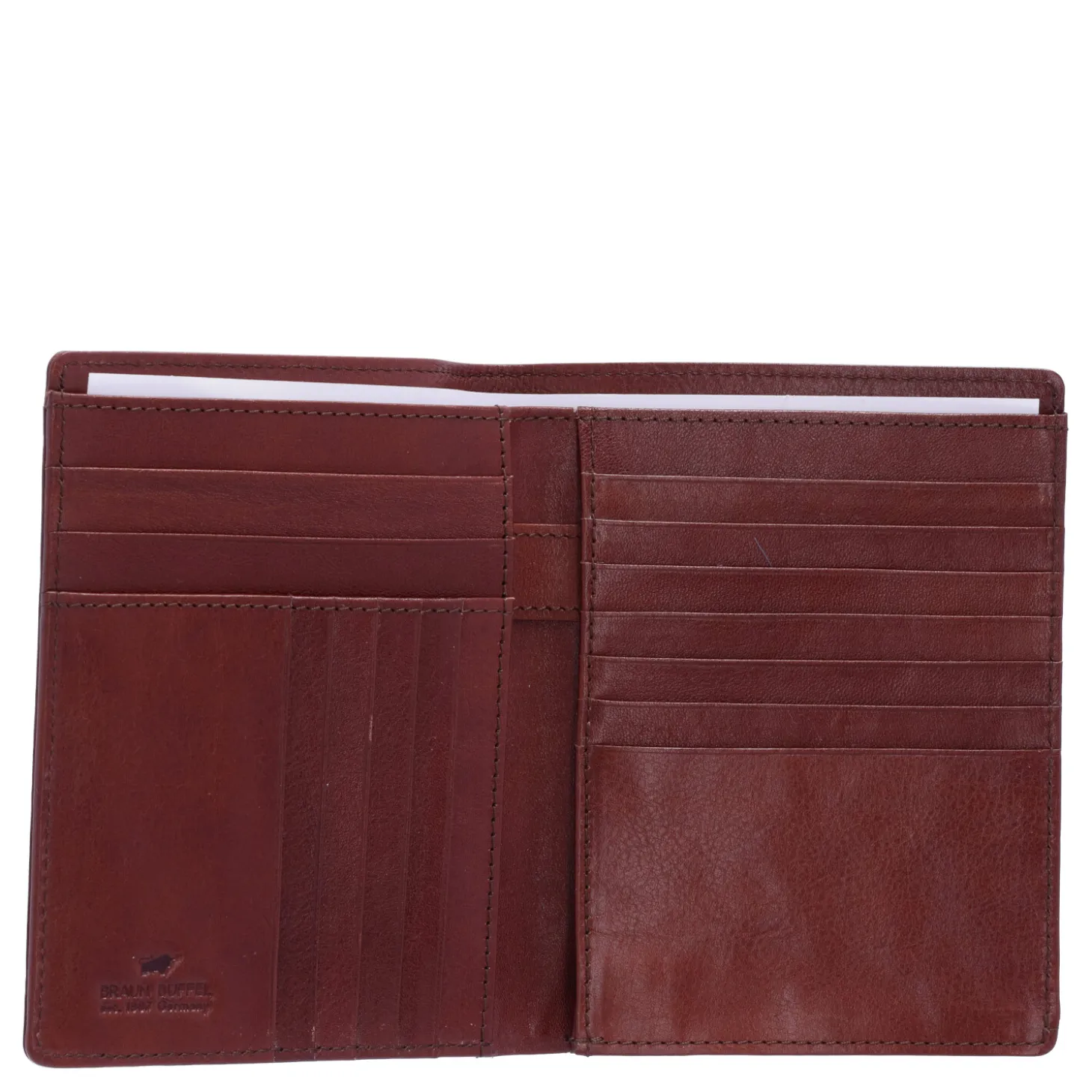 Brieftasche im Hochformat, schmal und elegant, gefertigt aus hochwertigem, vegetabil gegerbtem Rindleder. Die spezielle Anordnung beim Öffnen gewährt einen klaren Überblick über alle Karten. Durch großzügige Steck- und Scheinfächer bietet die Brieftasche ausreichend Platz für zusätzliche Karten, Geldscheine und Belege. Ein geschickt integrierter Stifthalter in der Mitte komplettiert die funktionale Gestaltung dieser stilvollen Brieftasche.