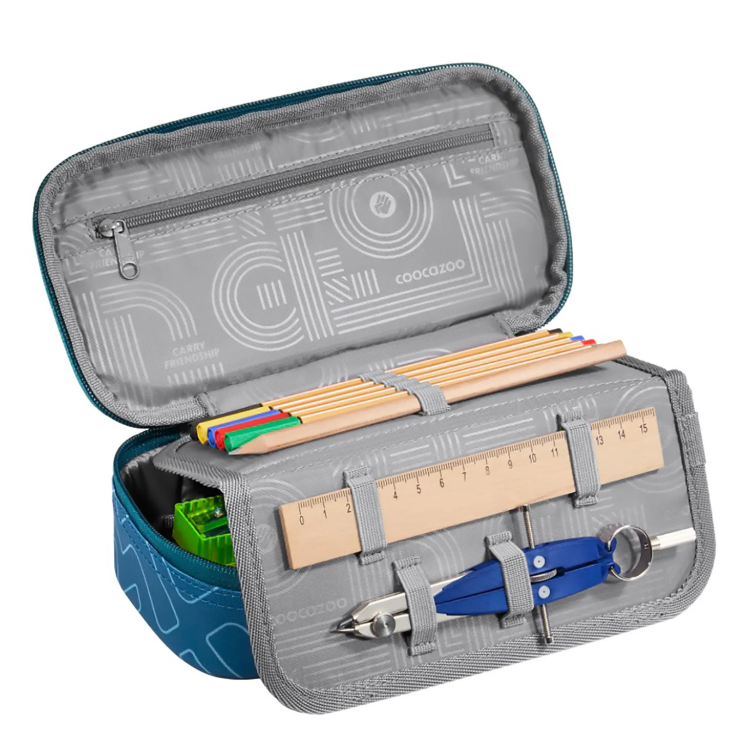 In diesem Schlampermäppchen geht nichts verloren, dafür sorgen sechs Schtifschlaufen und extra Fächer für Geodreieck, Zirkel und Lineal. Kleine Dinge wie Tintenpatronen, Münzen und USB-Sticks sind in einem extra Reißverschlussfach sicher aufgehoben.