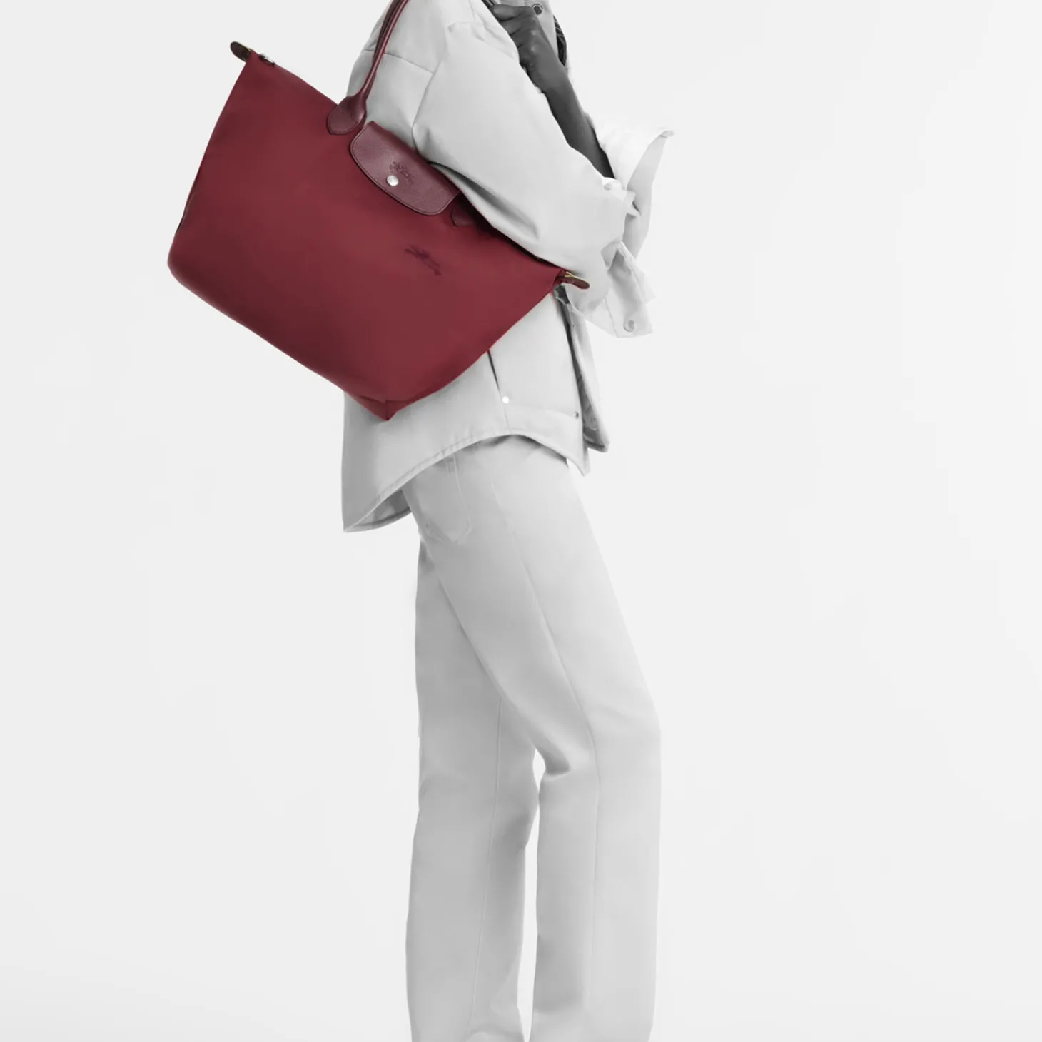 Wie alle Modelle aus dieser Serie läßt sich auch dieses auf eine minimale Größe zusammenfalten. Die Inspiration zu der speziellen Falttechnik ist auf die japanische Origami-Kunst zurückzuführen und machte die LE PLIAGE von Longchamp zu einem weltweiten Klassiker.