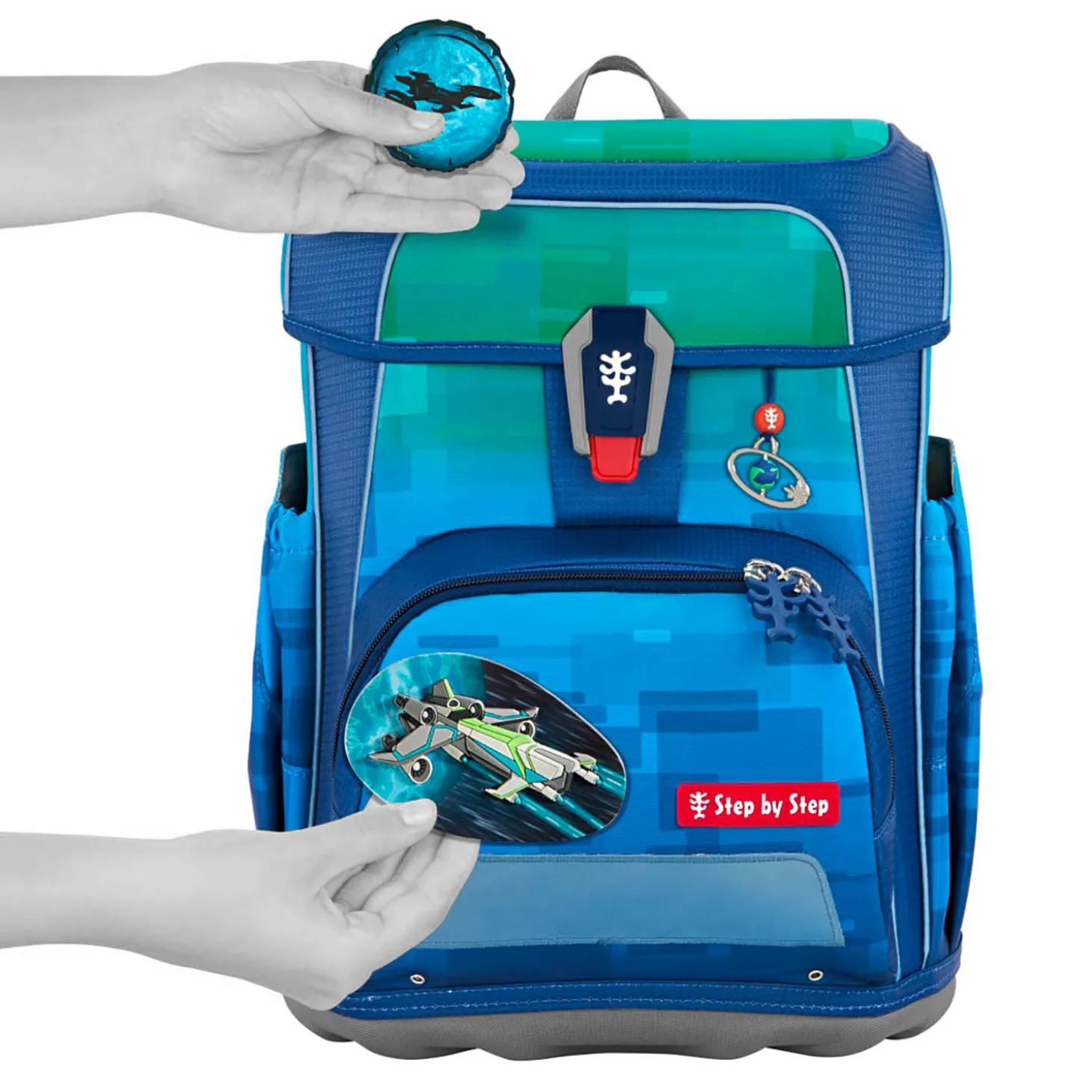 Der CLOUD von Step by Step kommt natürlich nicht alleine zu Ihnen. Das Set beinhaltet neben dem Schulranzen ein gefülltes Federmäppchen, ein Schlampermäppchen, einen Sportbeutel, der sich am Schulranzen befestigen lässt und ein Set Magic Mags bestehend aus zwei Magneten und einem Anhänger. Die Magneten können nach Lust und Laune auf dem Schulranzen befestigt werden.