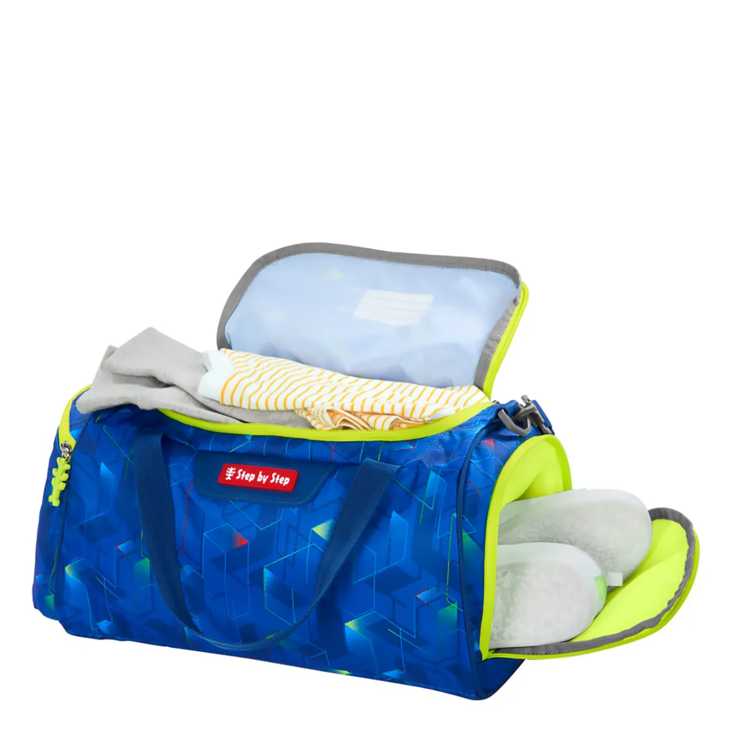 Diese Sportasche von Step by Step ist die ideale Ergänzung zu den Schulranzen, aber natürlich auch jederzeit ein zuverlässiger Begleiter auf dem Weg zum Freizeitsport.