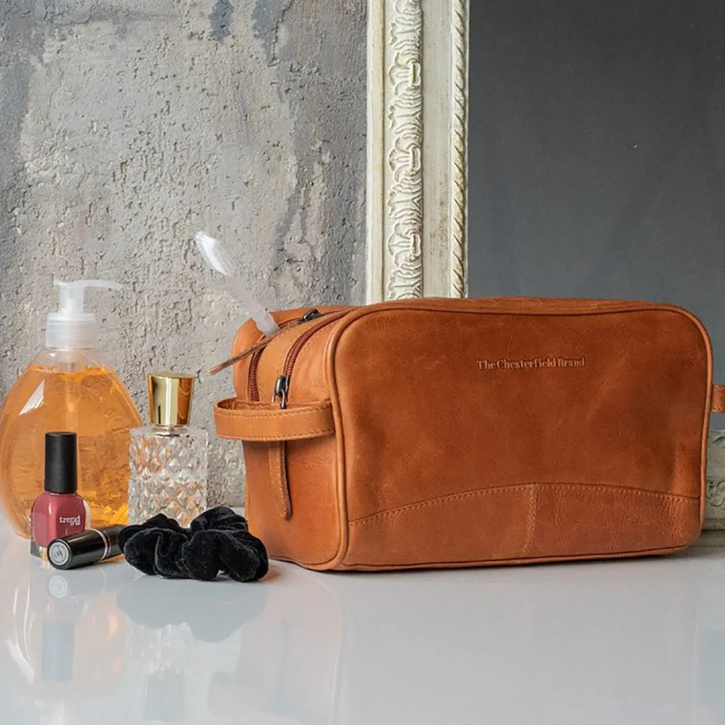 Diese hübsche Kulturtasche heißt Stacey und kommt aus dem Hause The Chesterfield Brand. Sie ist aus edlem Wachs-Pull-Up Leder und dadurch besonders geschmeidig. Das Innenfutter ist aus einem glatten, strapazierfähigen Synthetikmaterial, welches sich leicht reinigen läßt. Die beiden Hauptfächer schließen mit einem Reißverschluss und bieten ausreichend Platz für alle essentiellen Necessaires. Eines der Fächer hat eine zusätzliche kleine Reißverschlusstasche. Mit diesem Liebling ist man auf jeder Reise stilvoll ausgestattet.